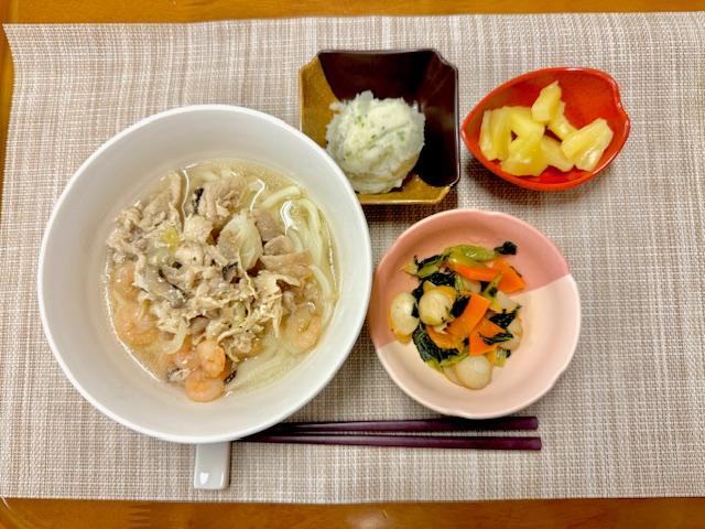 ちゃんぽんうどんは豚肉、キャベツ、しいたけ、海老と具沢山でしたが、