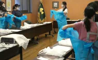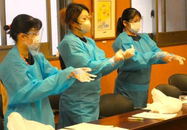 お互いに確認し合い、マスク、ゴム手袋、防護服、フェイスシールドを正確に着脱しました。