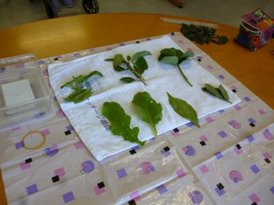 さつま芋の葉や大根の葉、モロヘイヤに落花生など様々な葉を使って音色を確かめながら、