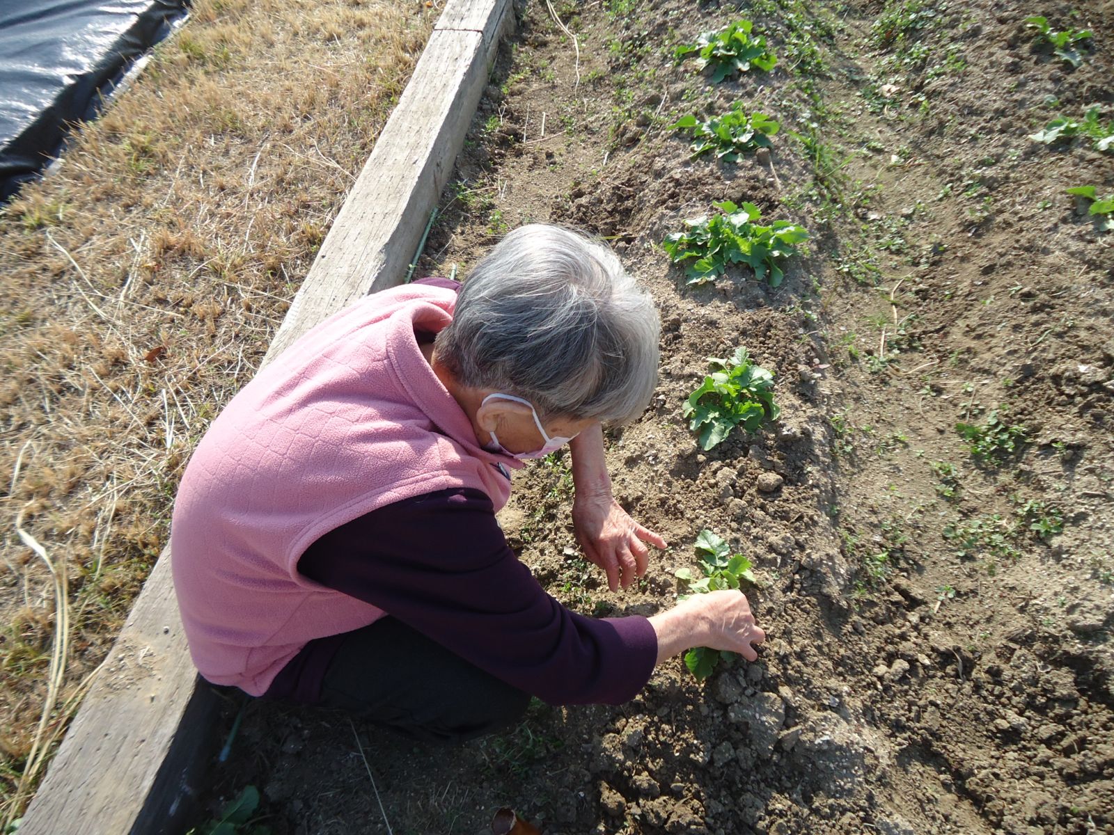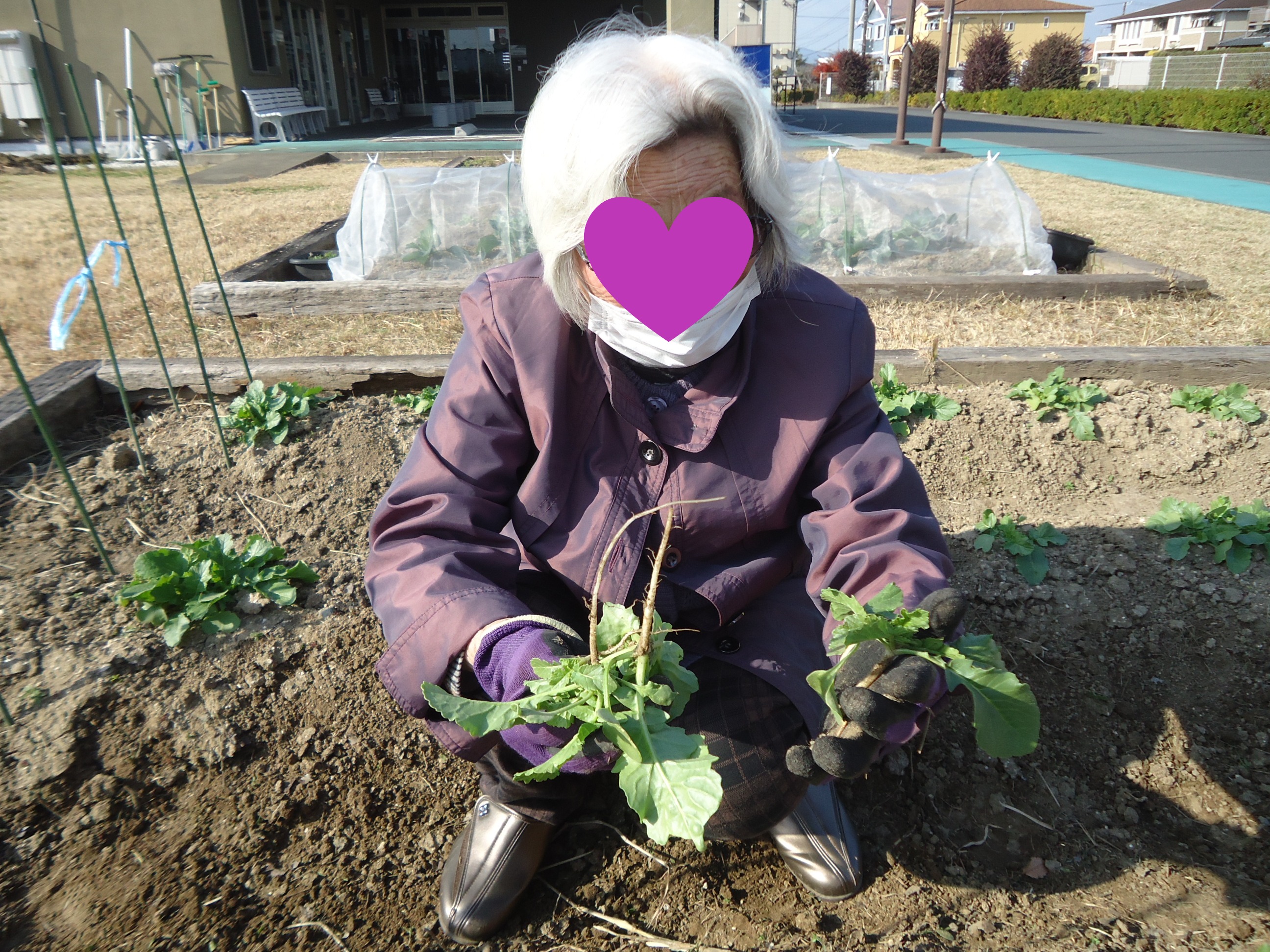 今日はお天気が良く暖かかったこともあり、利用者様にデイサービスの畑の大根を間引きしていただきました。
