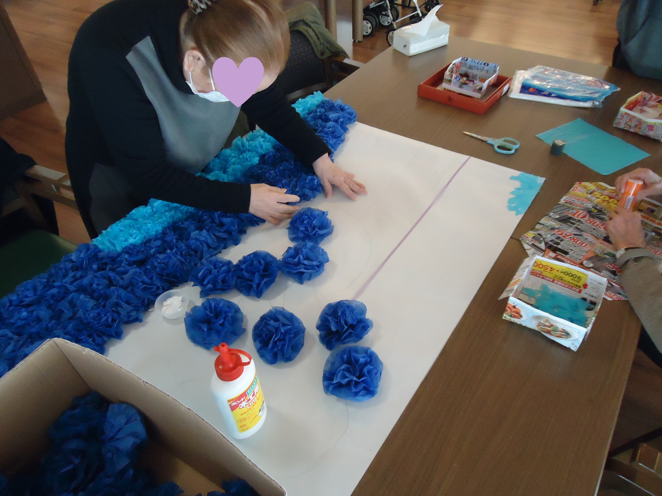 花紙で作った花を画用紙に貼る方。水色の花紙をちぎって貼り付ける方。それぞれ分業で取り掛かっています。