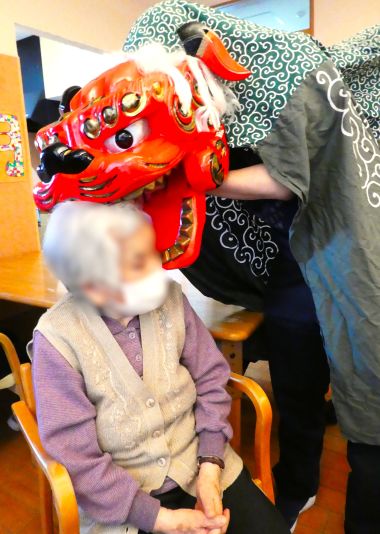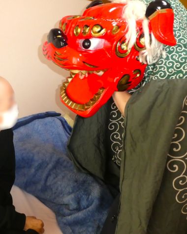 噛まれると、無病息災で過ごす事が出来ると言われる獅子舞。皆さん、びっくりしながらも喜ばれていました。