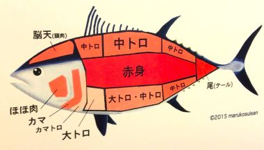 鮪の重量は38Kg!赤身、中トロ、大トロ、中落ちと手際良くさばかれていきます。