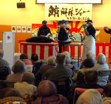 先日、ケアホームしあわせにて地域の方、入所者様、デイサービス利用者様をお招きして鮪解体ショーを盛大に開催しました。