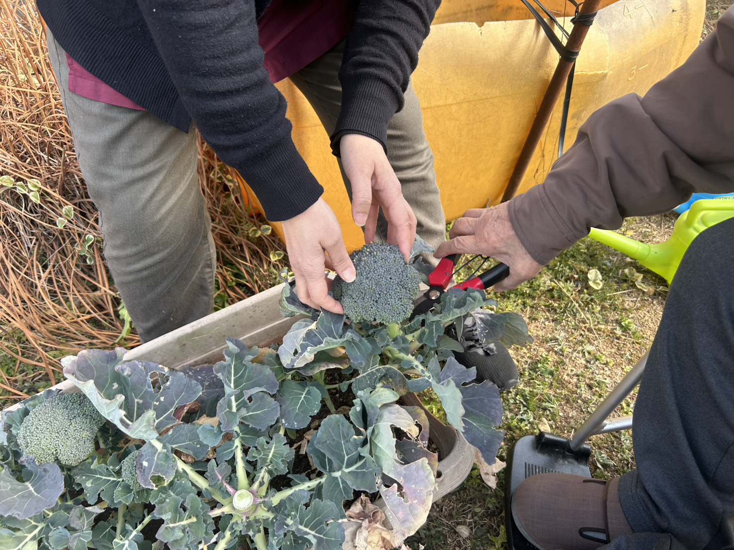 利用者様と一緒にデイ畑で育てている野菜を一部収穫しました。