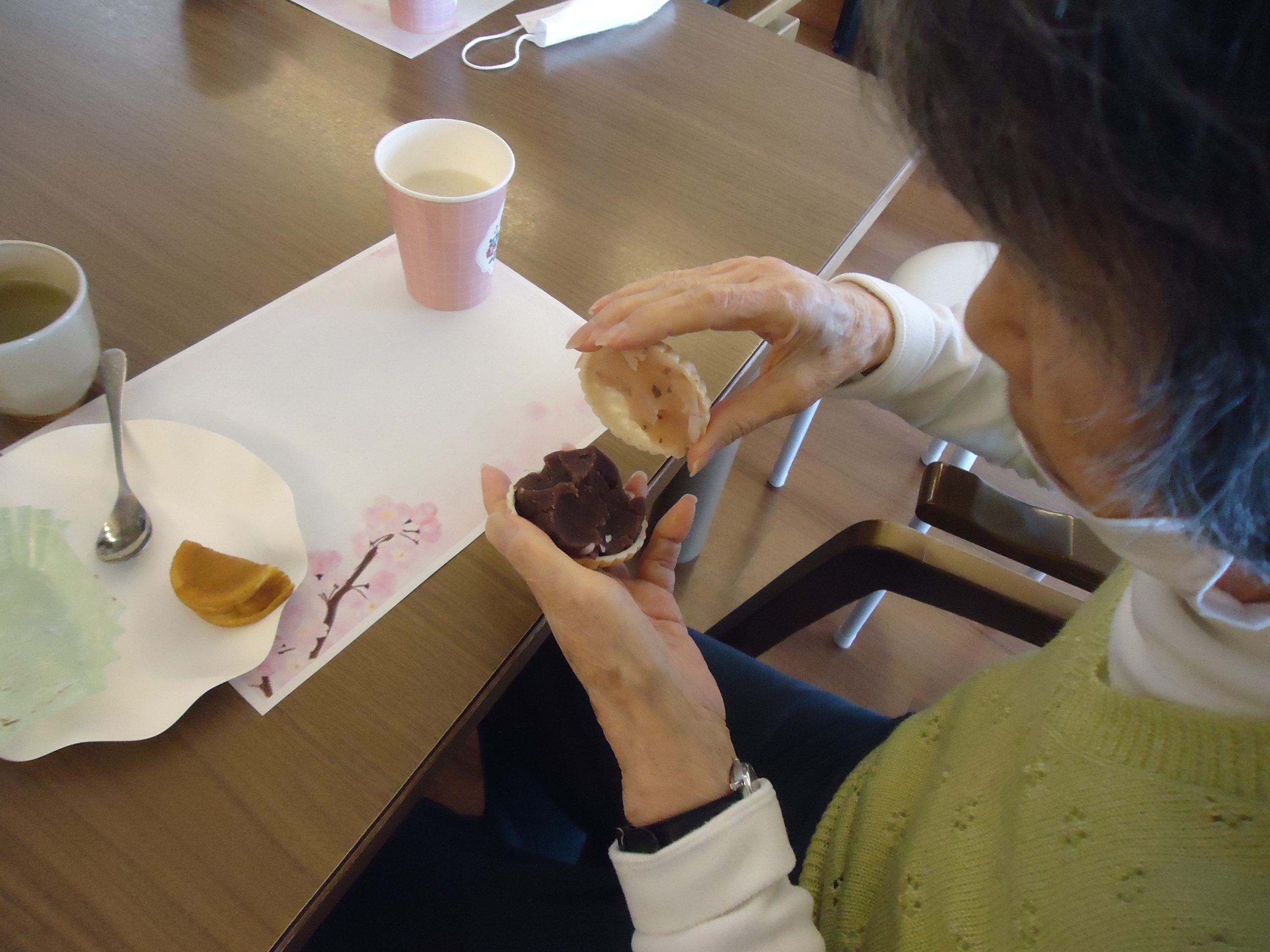 本日のデイサービス都田の里では、手作りおやつの『もなか』をご用意しました。