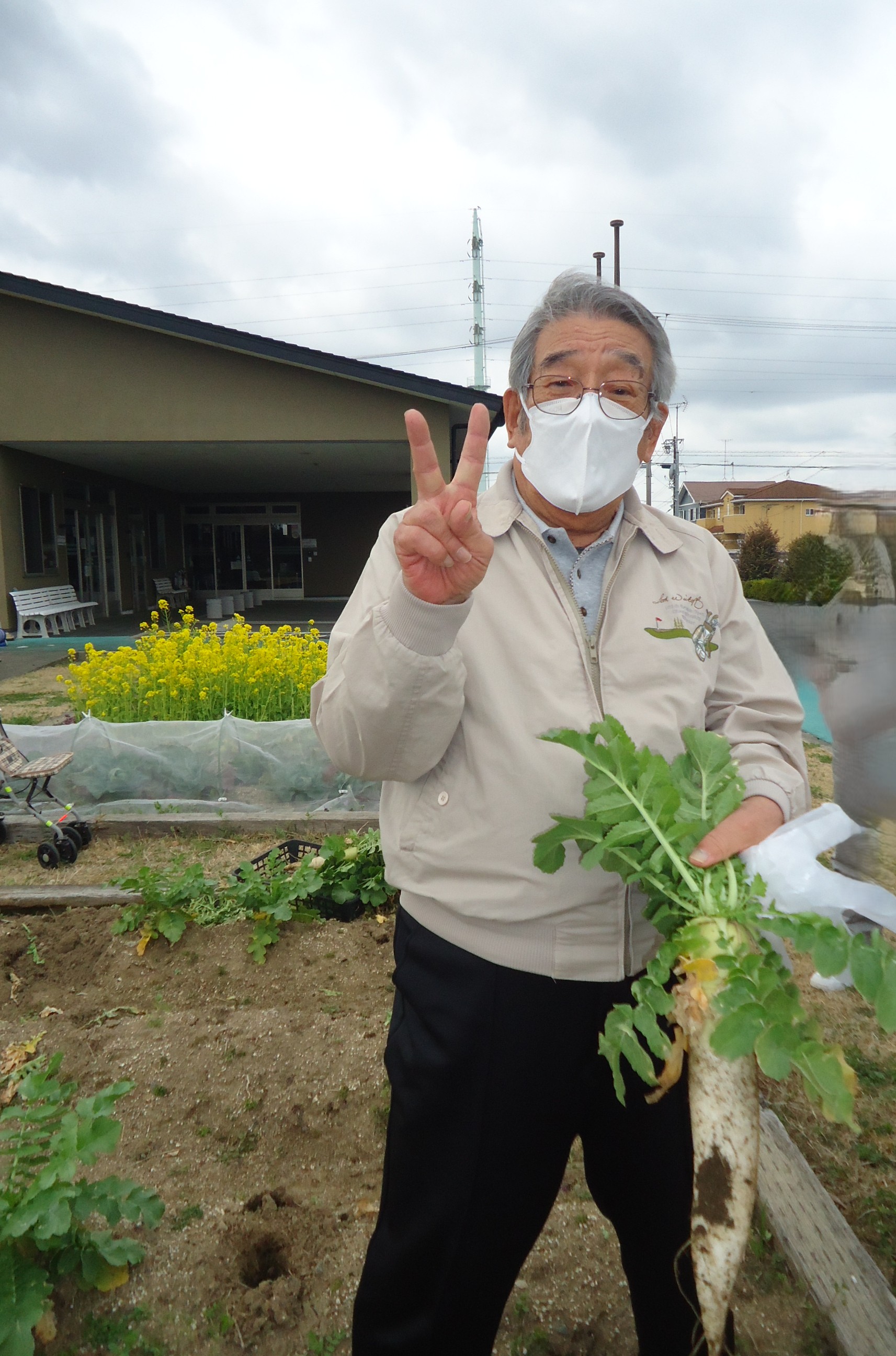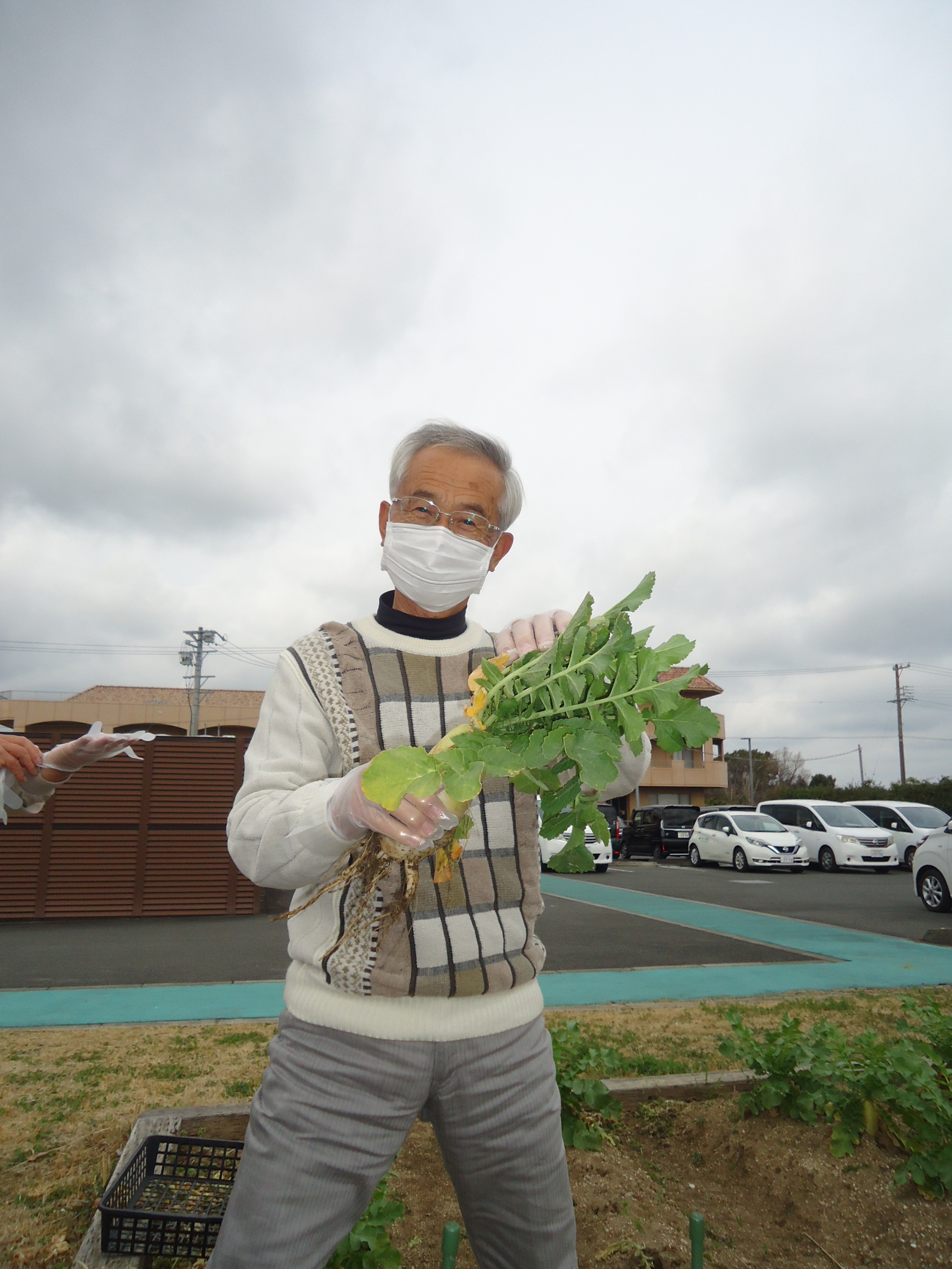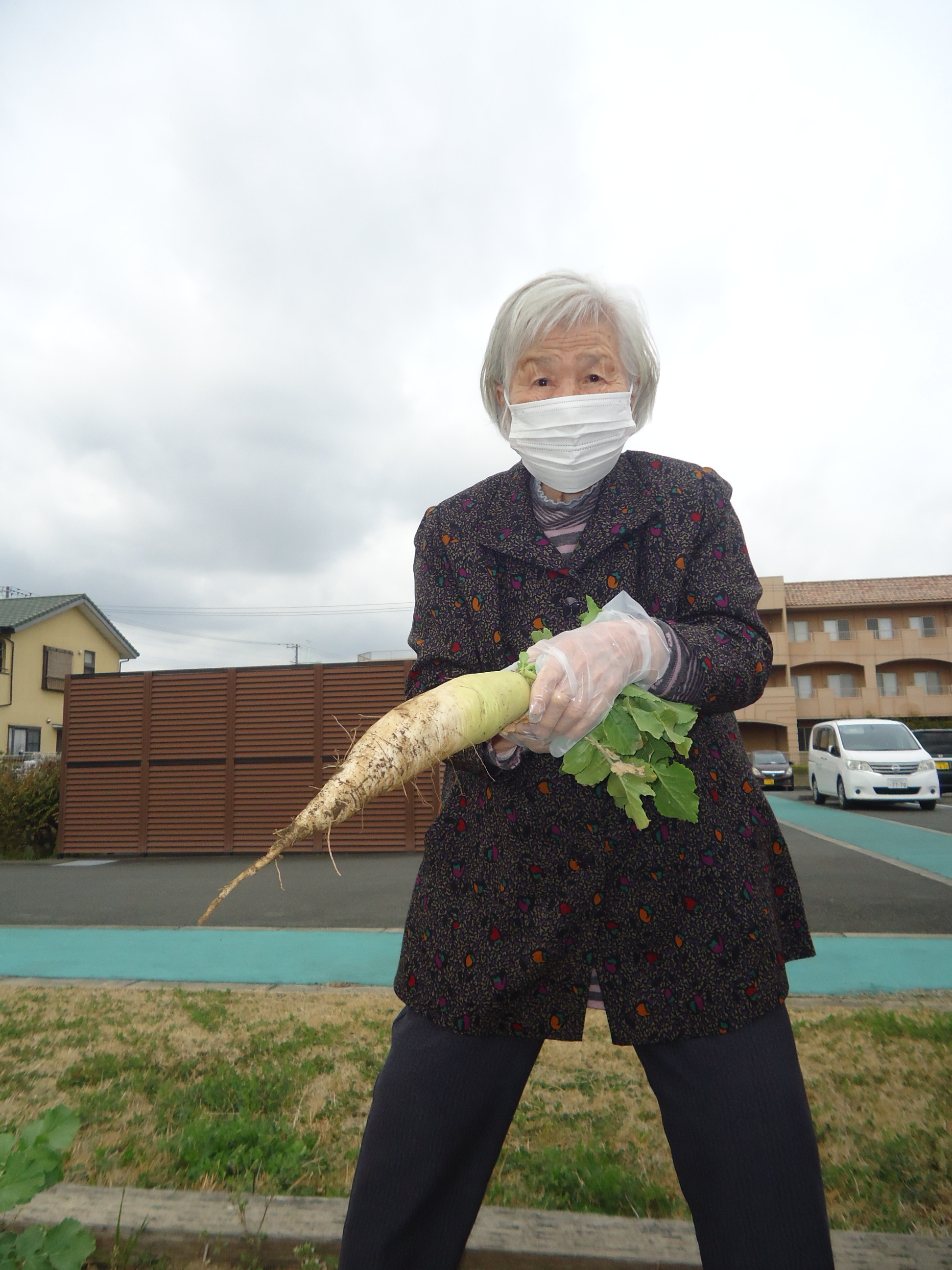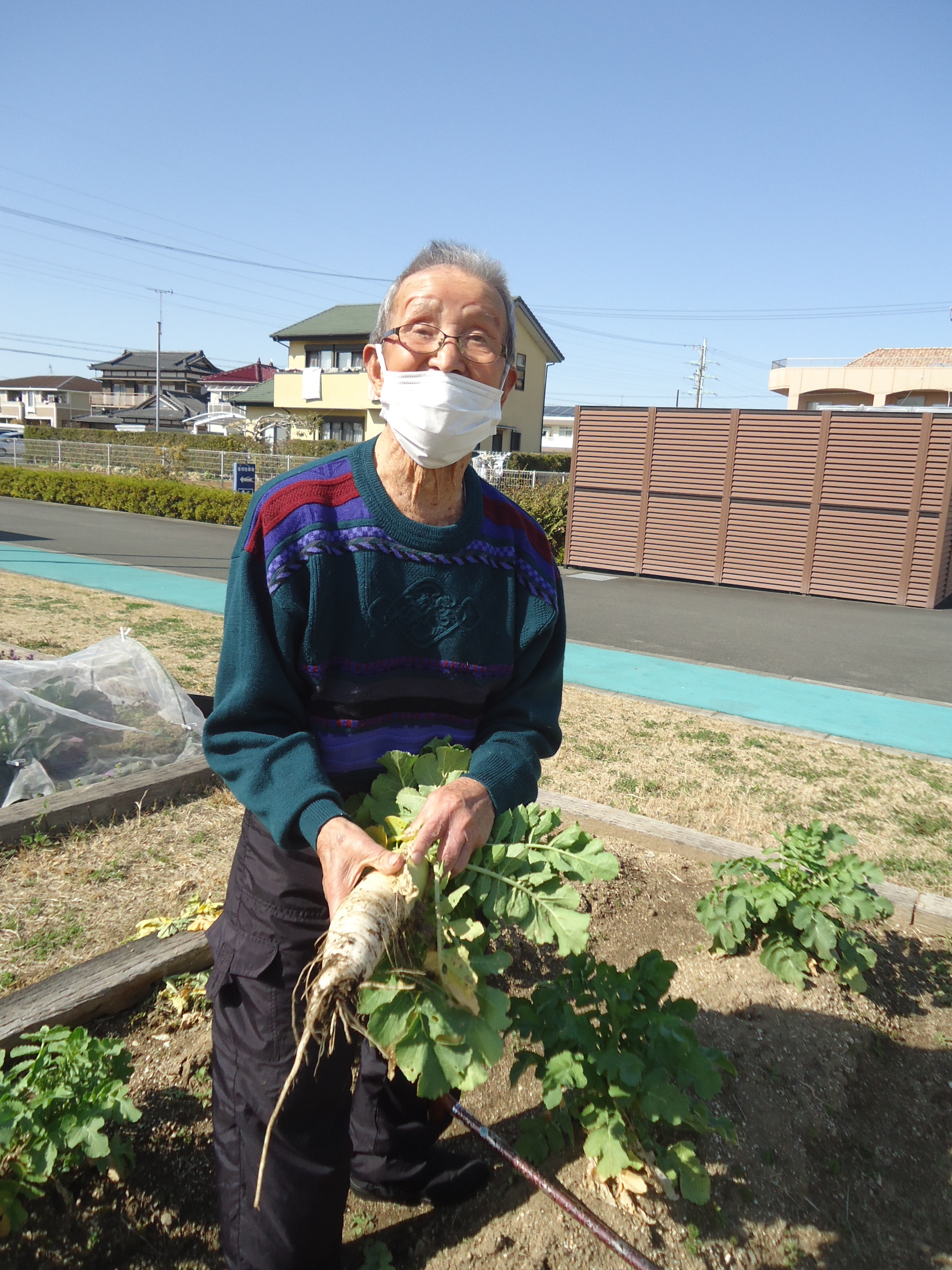 デイサービスの畑で育った大根を採りました。
