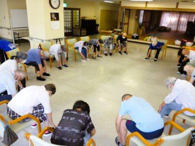 ケアハウスの入居者様は、暑さに負けず日々のラジオ体操&ストレッチに加えて